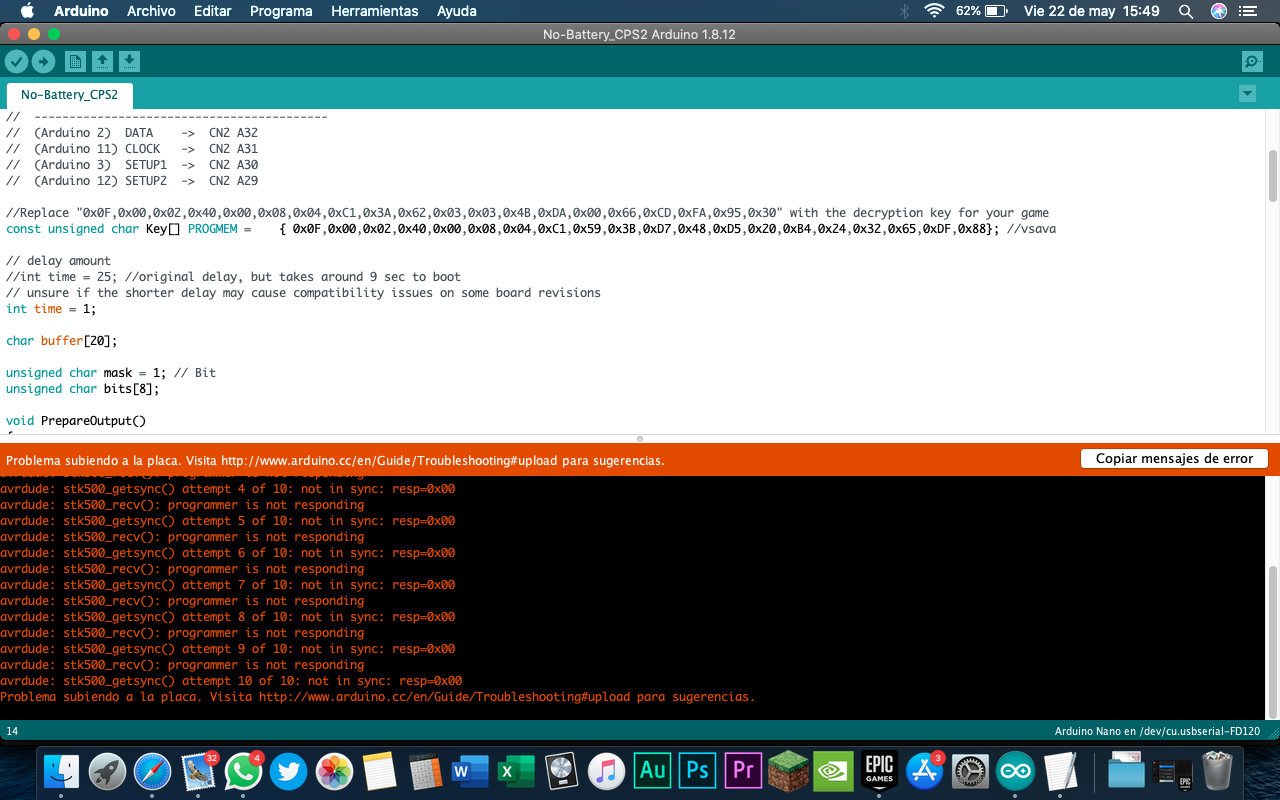 Hace unos días aprovechando que ando en casa de mis padres (que es donde están mis Arcades :P) me decidí a revivir un cps2 que tengo de Darkstalkers, lo compré hace tiempo en un viaje del trabajo y pues no había podido meterle mano. Bueno, en resumen, pedí ayuda en twitter y como es costumbre el buen Artemio y RogeNES me mandaron ligas de las nuevas soluciones para revivir esos cps2 con batería muerta, yo en esta ocasión opté por la opción del arduino NANO por costo y comodidad.
