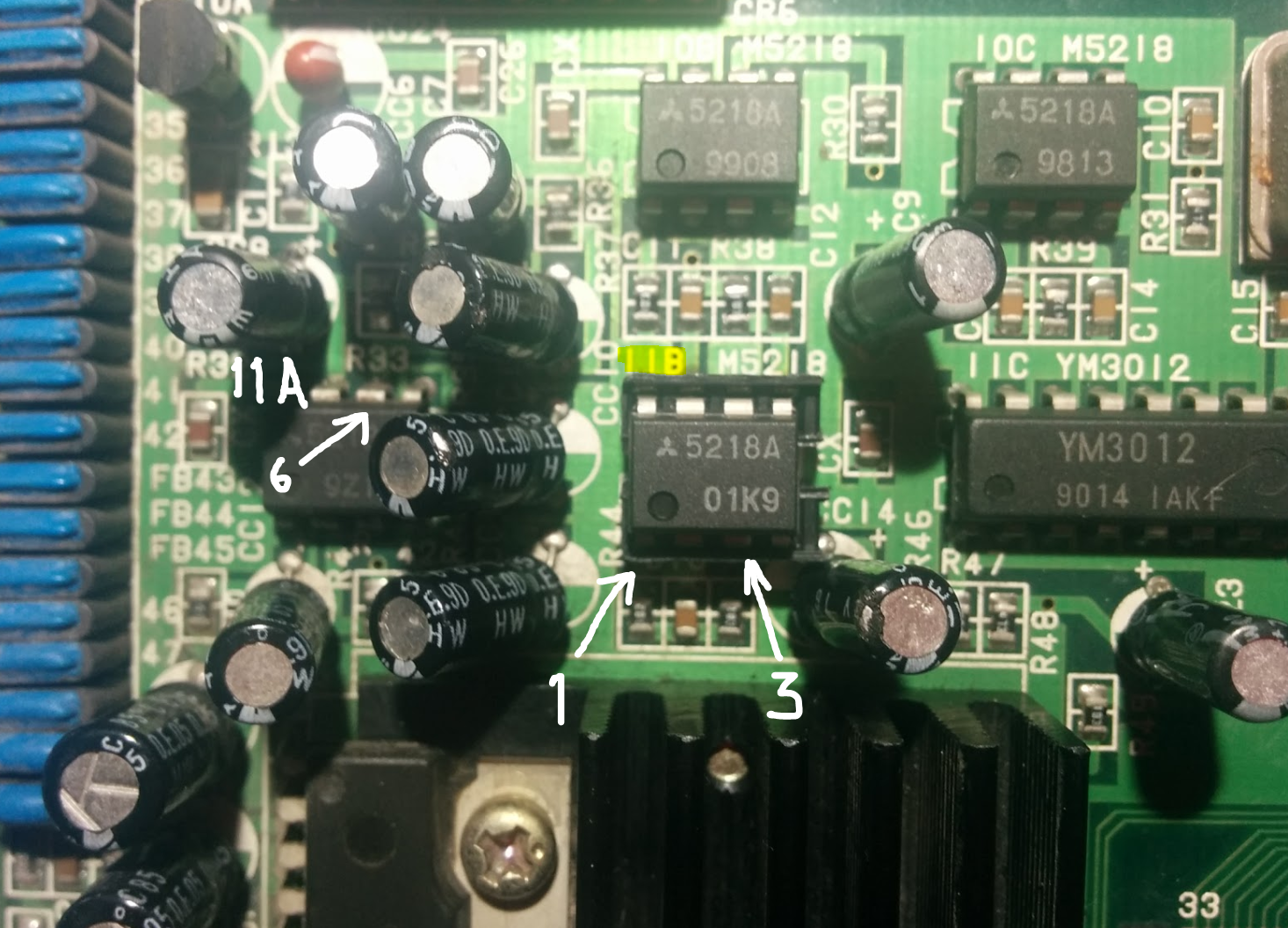 Por otra parte si al conectar la punta con audífonos al pin#3 del 5218A ubicado en 11B escuchas los sonidos faltantes, entonces ahora mide el pin7 de ese mismo chip, si ahí ya no escuchas nada, entonces el problema está en la circuitería alrededor del 5218A ubicado en 11B o el propio 5218A. Revisa las resistencias R44(1K), R45(10K) y capacitor C16 (393 = 39nF). También debes revisar R38(10K) y C12(182). Si aún no tienes audio en la salida #7 cambia el 5218A.