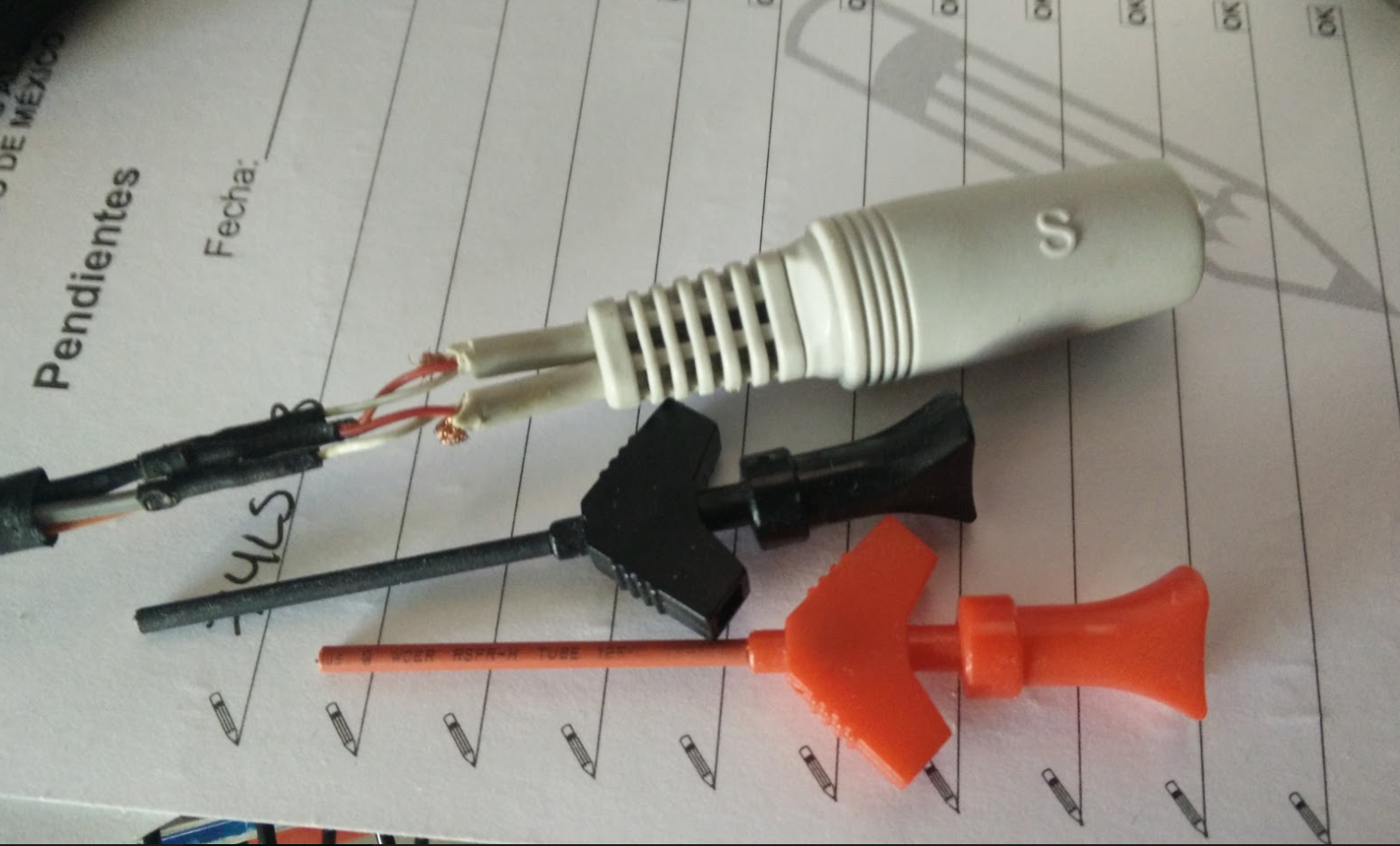 Yo usé un adaptador para audífono con un cable miniplug como el de la imagen y adaptarle unas puntas como las que se muestran. Una punta debe conectarse a tierra en la PCB y la otra se usará para medir en algunos puntos específicos.