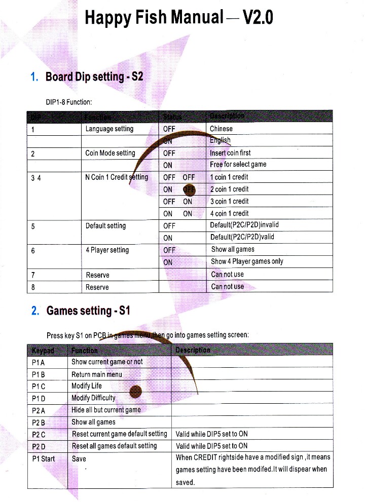 Happy fish fue de las primeras PCB Multijuegos que rondaron el mercado, por alla de 2009 y 2010 junto con blue elf y demas similares; happy fish 2 tiene 302 juegos pasables; dejo algunas especificaciones para quien le sirvan o se haga de una de ellas