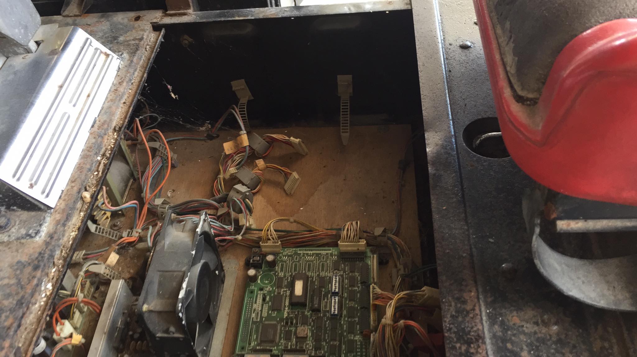aun asi procedi a terminar de abrirla y tratar de sacar todos los componentes que pude y darles una limpiada, pase a conectar todo de nuevo la encendi y la pantalla queda en negro, el volante no reacciona y no hay ningun sonido, al parecer al estar investigando el componente que hace falta se llama Servo Motor Drive, para mi seria de mucha ayuda si alguien tiene un simulador de sega que pueda sacarme esa duda y saber si ese es el motivo del por cual no funciona, al parcer los cables que se conectan ahi, van a el monitor y el control del volante y palancas