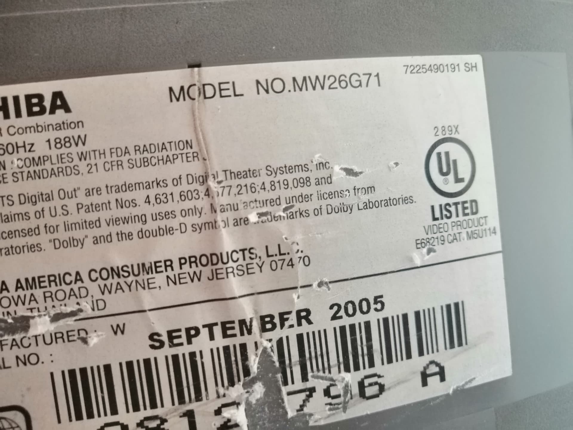 MODEL O TOSHIBA MW26G71