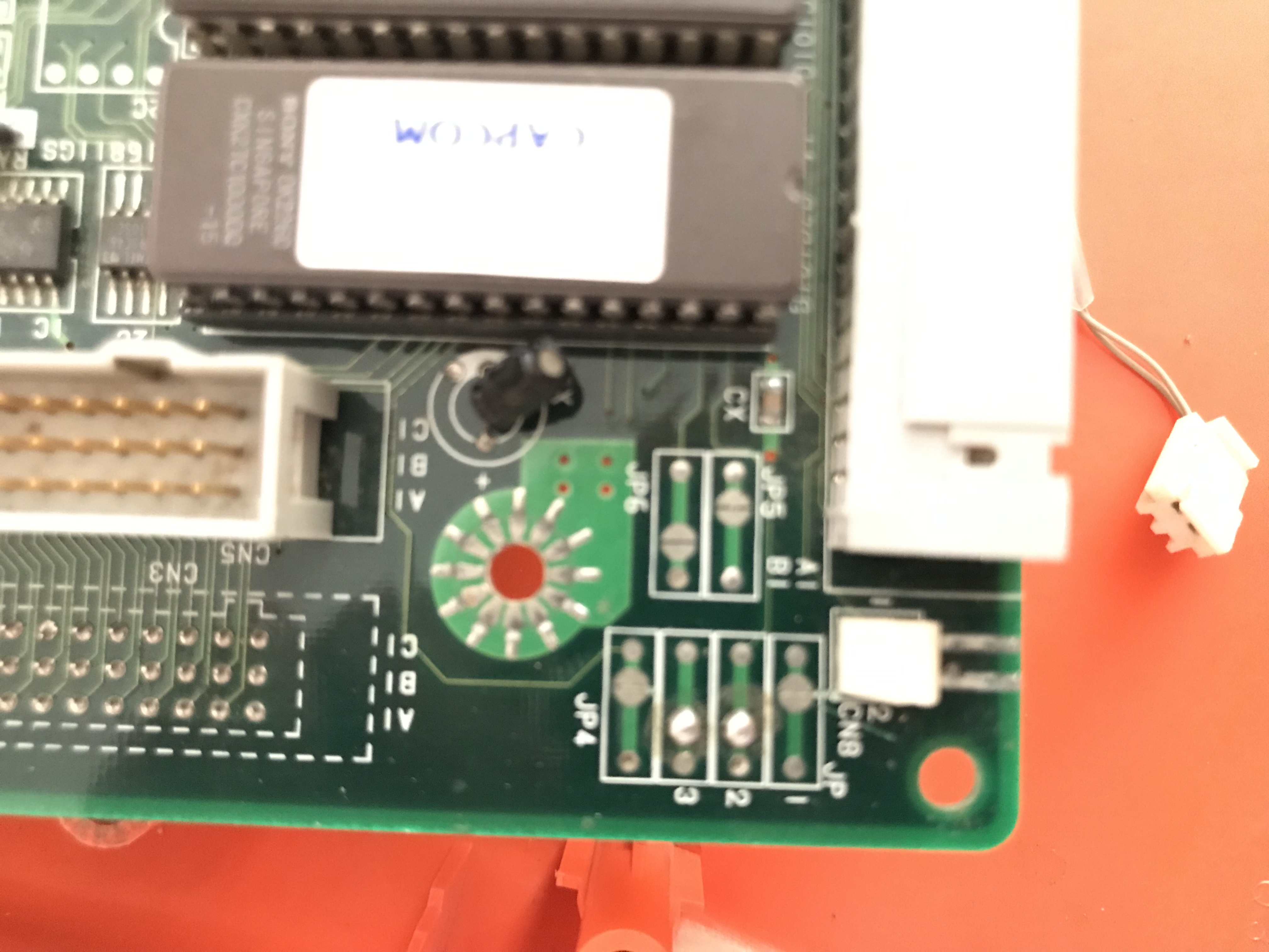 Que bueno que se soluciono tu problema, en cuanto a los jumpers JP8, JP9, JP10, JP11, JP12, JP3 estan correctos, JP1, JP2, JP3,JP4 parece que la configuración esta mal, el orden correcto es JP1 = Cerrado, JP2 = Abierto, JP3 = Abierto, JP4 = Cerrado, JP5,JP6 pareciera que están correctos pero me queda la duda, el orden correcto es JP5 = Cerrado, JP6 =Abierto, la Rom 01 parece que el eprom es un 27C1000 de acuerdo al siguiente post deberian ser 27c1001 o 27c010.