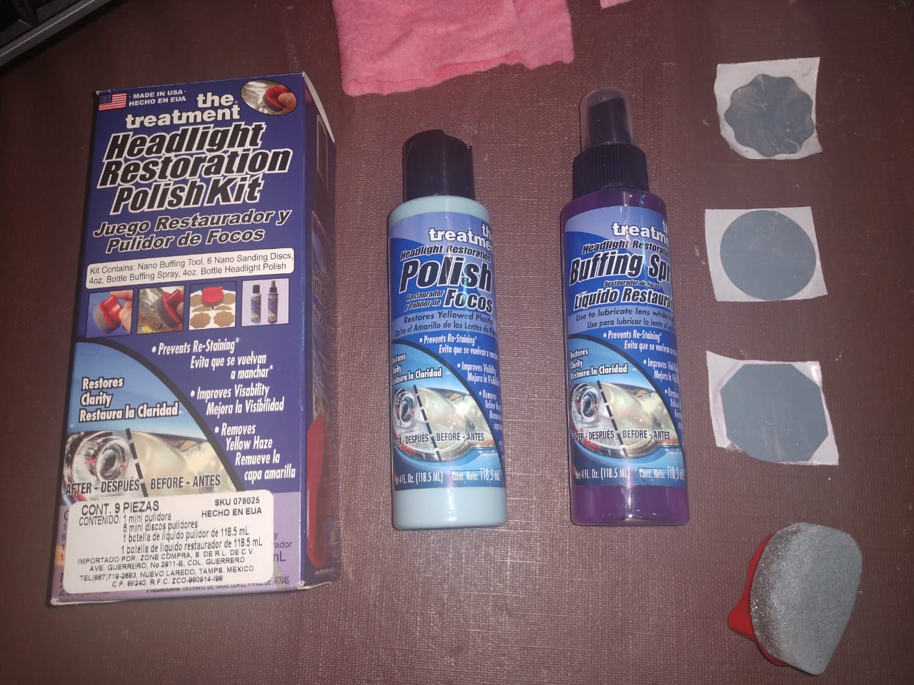 De preferencia busquen el set de restauración de faros que conseguí ya que incluye todo el material para realizar el trabajo. Lo conseguí en una tienda llamada Autozone de Monterrey no es muy caro. Es relativamente fácil conseguir el líquido sin todo el set, lo he comprado con anterioridad y lo utilice para lo que es, para quitar lo amarillento y opaco de los faros de mi auto.