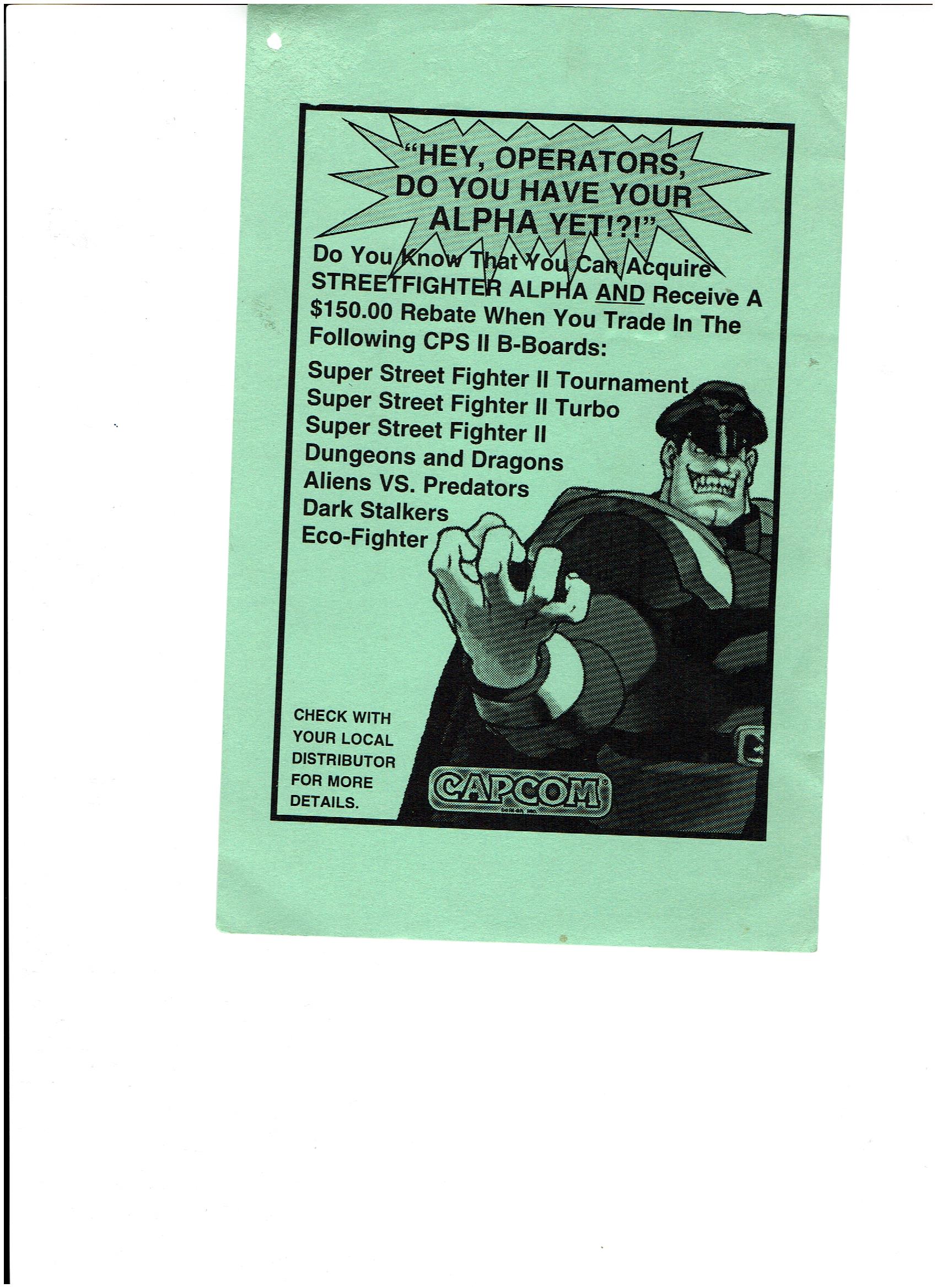 Este flyer, era con el que Capcom le daba la oportunidad, a los operadores de obtener un descuento en el Street Fighter Alpha en Estados Unidos, proponiendo que dieras el viejo juego de cps2 b-board y te daría 150usd a cuenta, para el nuevo juego Street fighter alpha, esto se hizo muy común en la trayectoria del cps2 y siempre se ofrecía A los 25 días después de la salida del titulo de salida y al día 30 se te entregaría el nuevo juego. esto era para darles una oportunidad ha aquellos operadores que lo compraban de salida con el gabinete con el juego para recuperaran esa inversión, en México se hizo también así. pero como ya muchos saben ahora lo que hacian era reprogramar el juego nuevo en esa placa b que tenias y asi era absolutamente pura ganancia para capcom. ya que no era necesario importar equipos.
