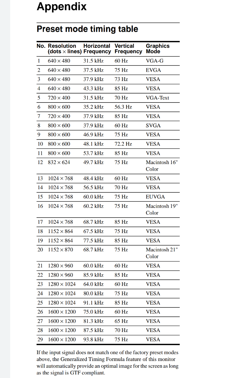 Hola a todos. Espero me ayuden a resolver este problema. Tengo un monitor Sony Modelo Multiscan e400 el cuál según el manual acepta estás resoluciones.