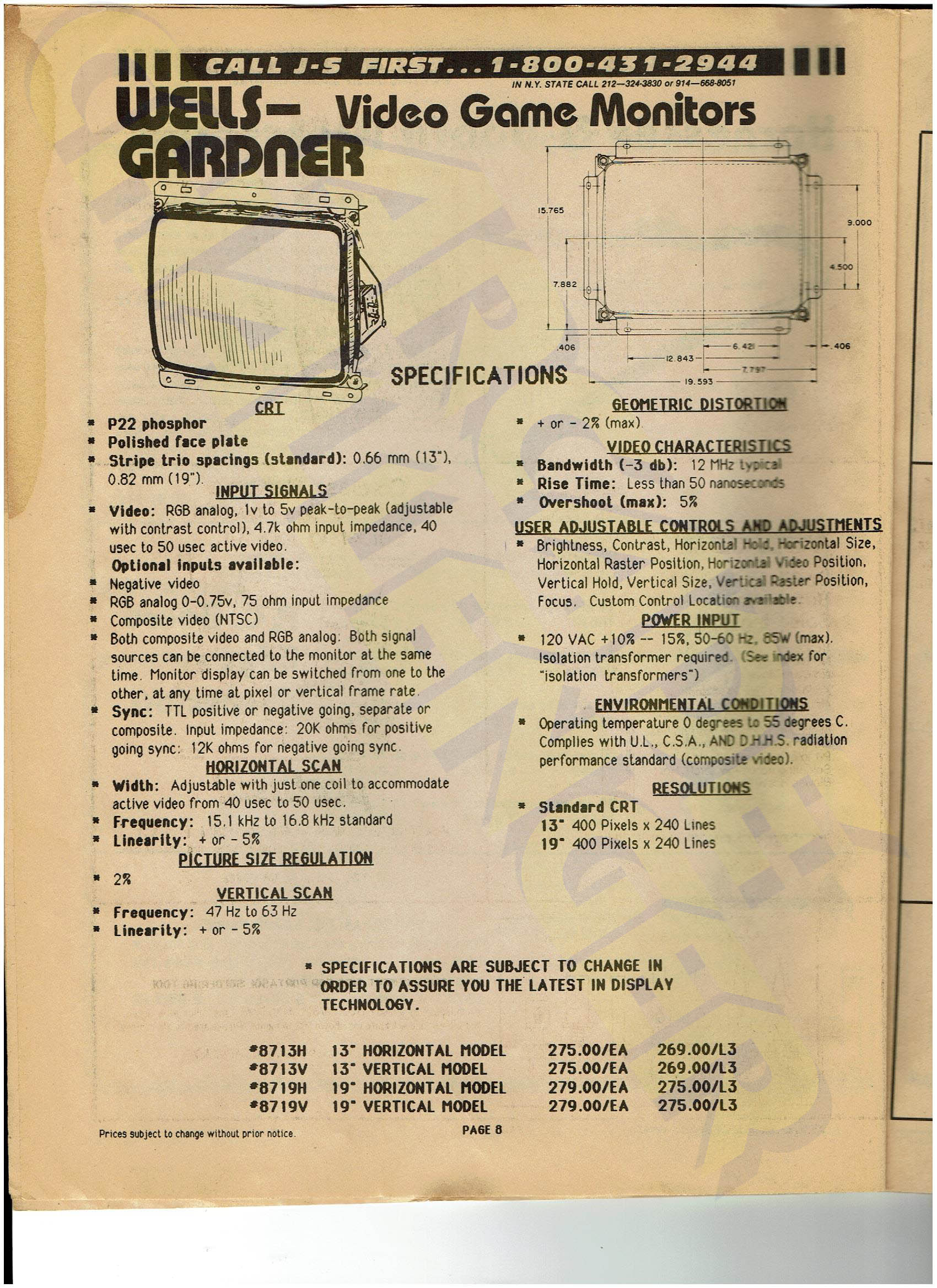 Aquí podrían leerse las especificaciones que tiene el monitor Wells gardner, y la importancia que ya tenia la sincronía positiva y negativa por los cambios que hubo en los monitores, muchos manuales de juegos pcb te advertían en el caso de no tener la sincronía correcta, te manejaba una forma de componerlo con un integrado TTl y cambiar unos capcitores y resistencias, aquí ya en este monitor te maneja los pins separados de sincronía positiva y sincronía negativa. verticales y horizontales , y esta marca fue por la que empezaron a manejarla en la mayoría de los gabinetes americanos a mediados de los 80' a los 90'