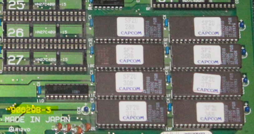Si no cometiste el error al dumpear y tus EPROMS efectivamente son de 256KB(es decir 27C020/27C2001), entonces puedes reemplazarlos por 27C010/27C1001 de 128KB y grabar lo roms correspondientes al programa del juego. La ubicación de las roms viene indicada en su propio nombre de archivo. Por ejemplo sf2e_30g.11e se ubica en la posición 30 en la placa B. De la misma manera para los demás roms.