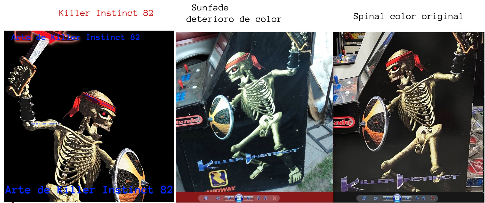 Pueden ver una degradacion del color en todas sus tonalidades entre maquinas originales Killer Instinct; la foto derecha conserva su color hueso y una cinta en el craneo color rojo, mientras que la foto del medio perdio su color original incluso la letras pasaron a un azul cuando son moradas. Si investigan por internet en Google veran muchas maquinas con degradado de color y casi no veran un Spinal con su color hueso original.