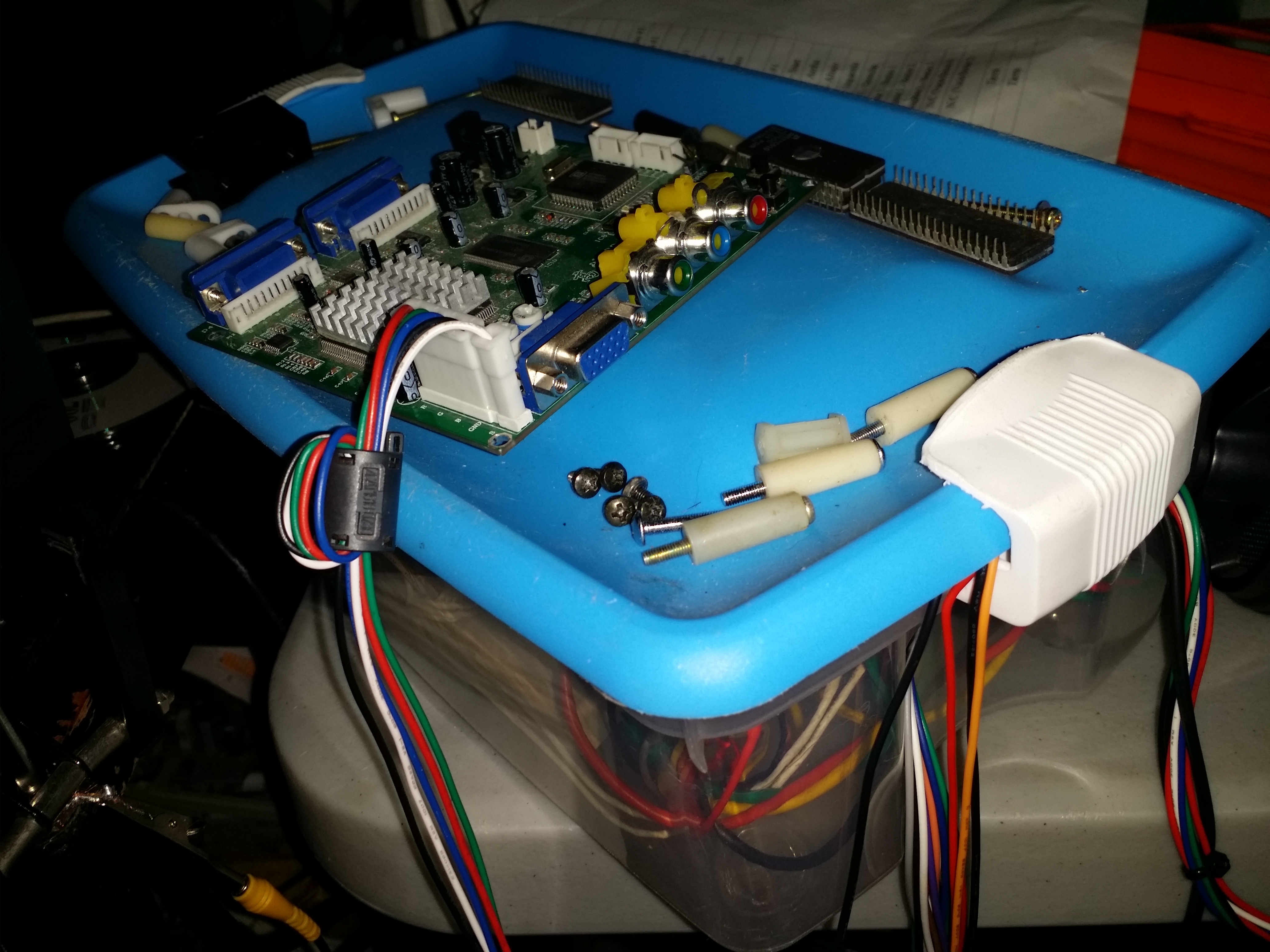 Esta parte depende mucho de cuanto le quieras invertir, y a donde lo vas a conectar. Una opción muy económica y funcional es un convertidor chino de "CGA a VGA", que convierte de 15khz a 31khz (240p a VGA en 640x480). Es el que ves encima de mi supergun de "tupper", y cuesta unos 35 USD más la importada. Las desventajas son que no tiene scanlines internos, y saca solo VGA... cosa que dependerá de tu display que tal funcione.