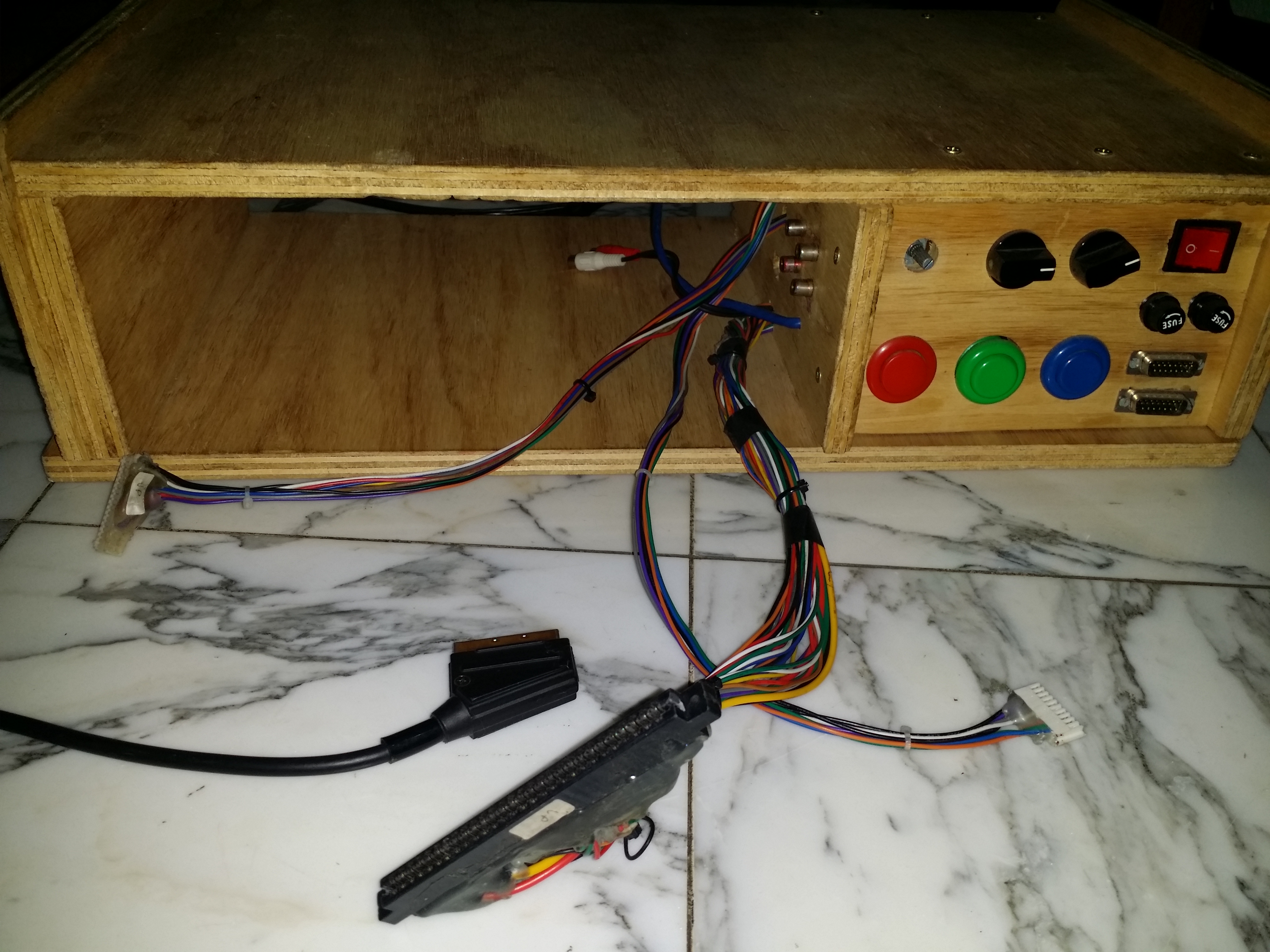 El ultimo detalle es un interruptor de poder, y con eso estas listo. Otras cosas que puedes necesitar, son arneses de patadas. De la foto puedes ver que le puse de CPS1 y de CPS2, estos solo están conectados a los DB15 del control para cuando uso controles de 6 botones, en mi caso unos de sega genesis adaptados.
