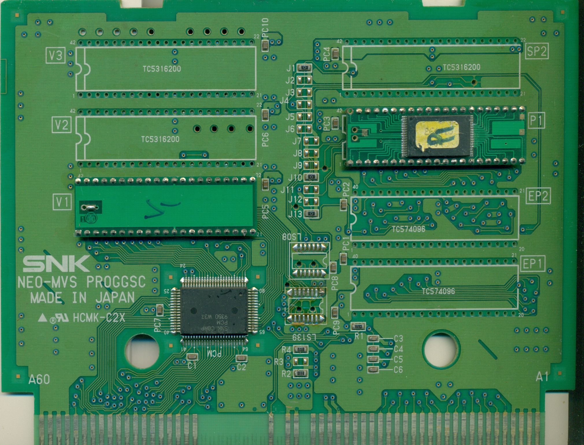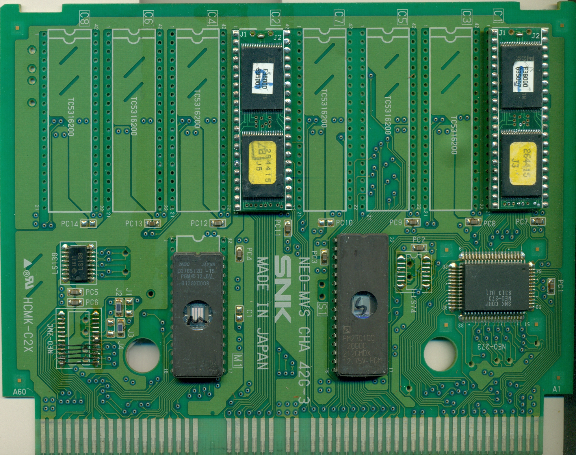 Las placas deben mostrar el logo de SNK, en el caso de los juegos de la última etapa, SNK/PLAYMORE, ya que en ocasiones, la etiqueta y el material del cassete son correctos, pero al revisar las placas no coinciden; puede darse el caso de que sean reparados, y no coincidir la apariencia física de los roms, pero igual, seguiría siendo original/reparado (algo a verificar también es la calidad de la soldadura, algunas serán pésimas reparaciones, con soldadura dispersa, o incluso daños/quemaduras a las placas).