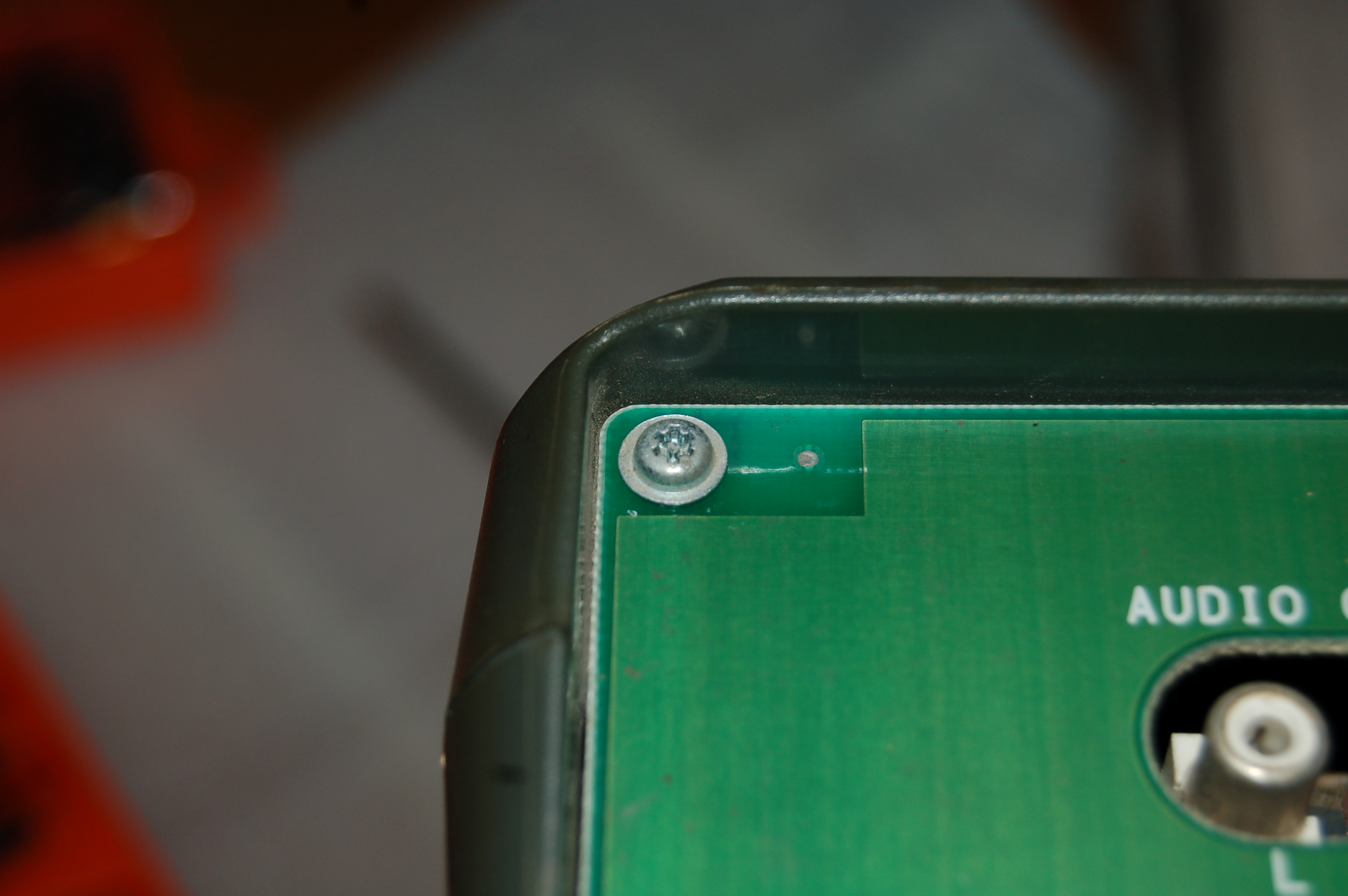 Para completar la modificación, se deben cambiar las líneas de dirección a la EPROM que contiene el código del audio, debido a que la EPROM resultante es de distinta capacidad que la original. Para esto se deben hacer dos cosas. La primera es cortar otra pista, la que une el pin 30 a los pines 31 y 32 de la EPROM, que se marca en la siguiente foto: