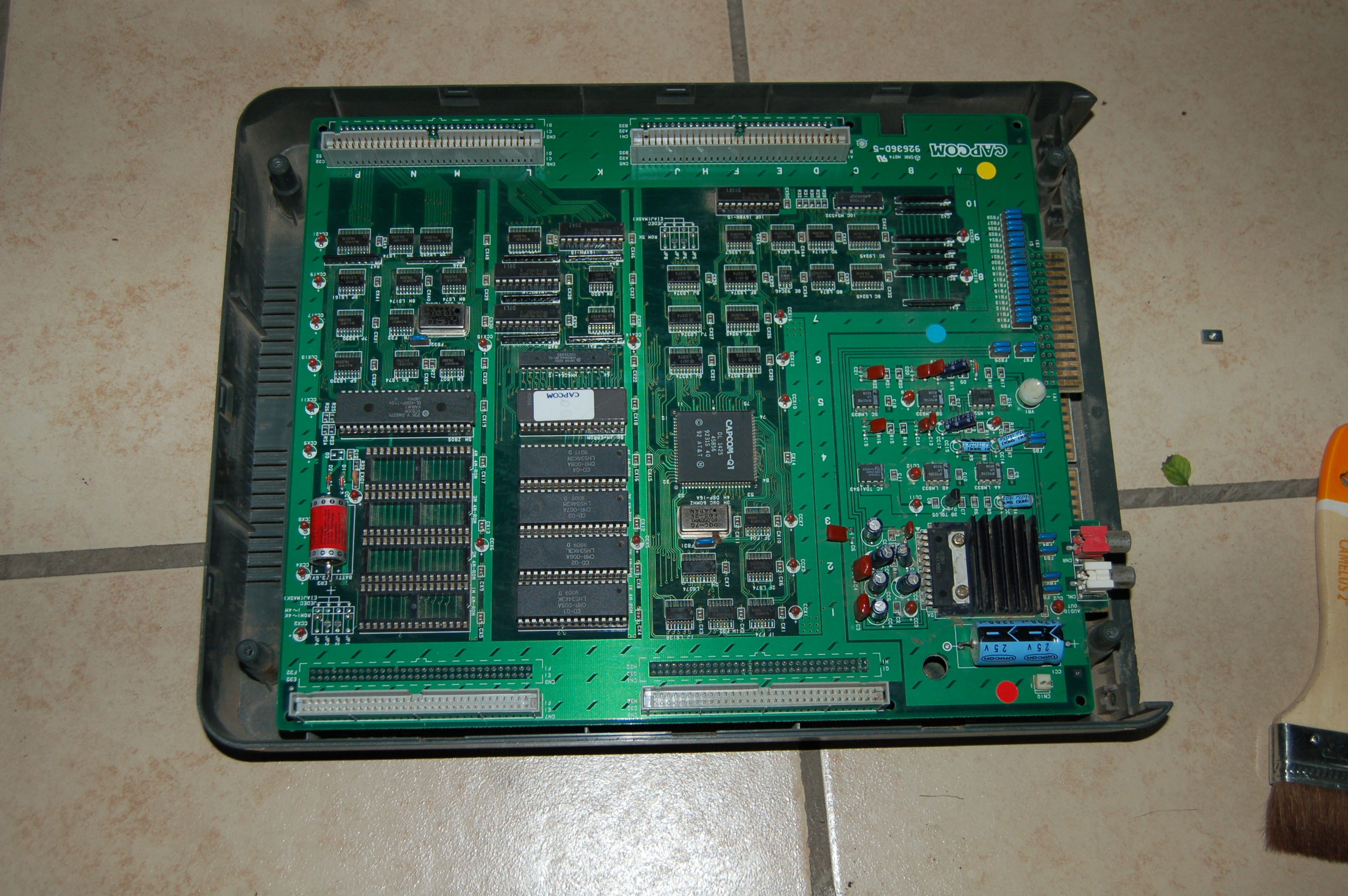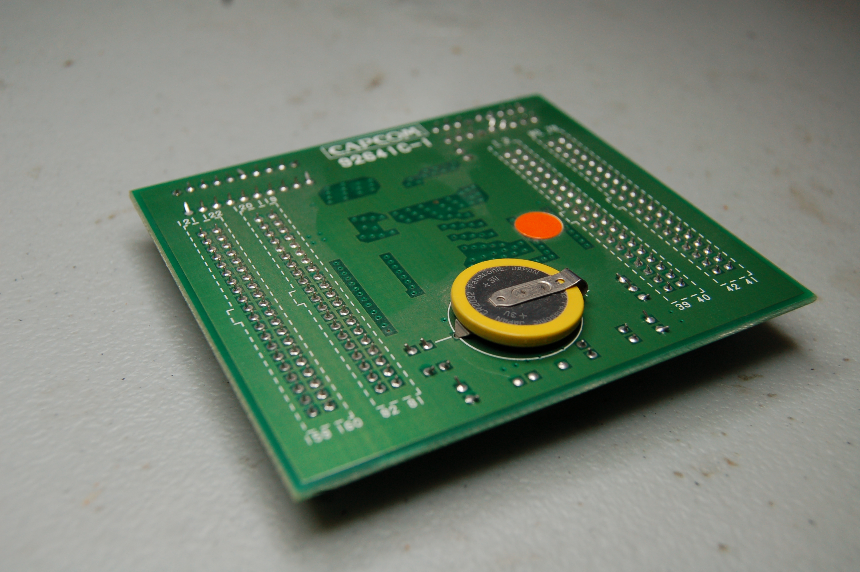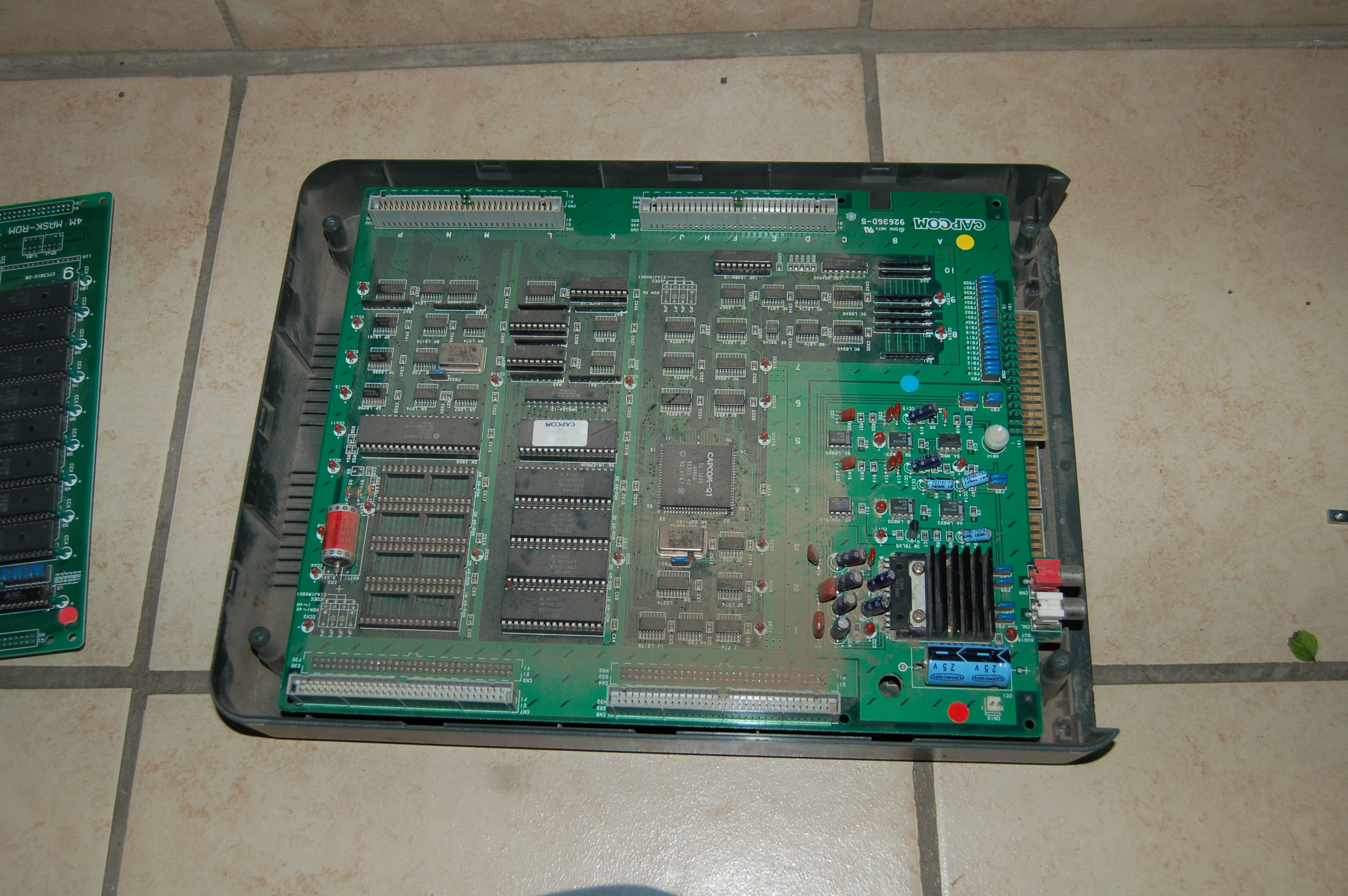 Bien, el procedimiento es de rutina pero algo laborioso y como siempre, hay que hacerlo con cuidado o podemos arruinar la PCB. Aquí les presento la placa encargada del video, como comentaba ésta contiene una batería que mantiene datos en SRAM dentro del chip "custom" de CAPCOM. Estos datos son llaves de cifrado (encripción) para poder ejecutar el código del juego. Cuando la batería se agota, el juego deja de funcionar. Los amigos de Dead battery society tienen documentado y resuelto este asunto, así como el de otros tantos juegos que cuentan con baterías suicidas de este tipo. La solución en este caso reside en alterar la placa de video para que ejecute código descifrado, y cambiar el código del juego por la versión ya descifrada.