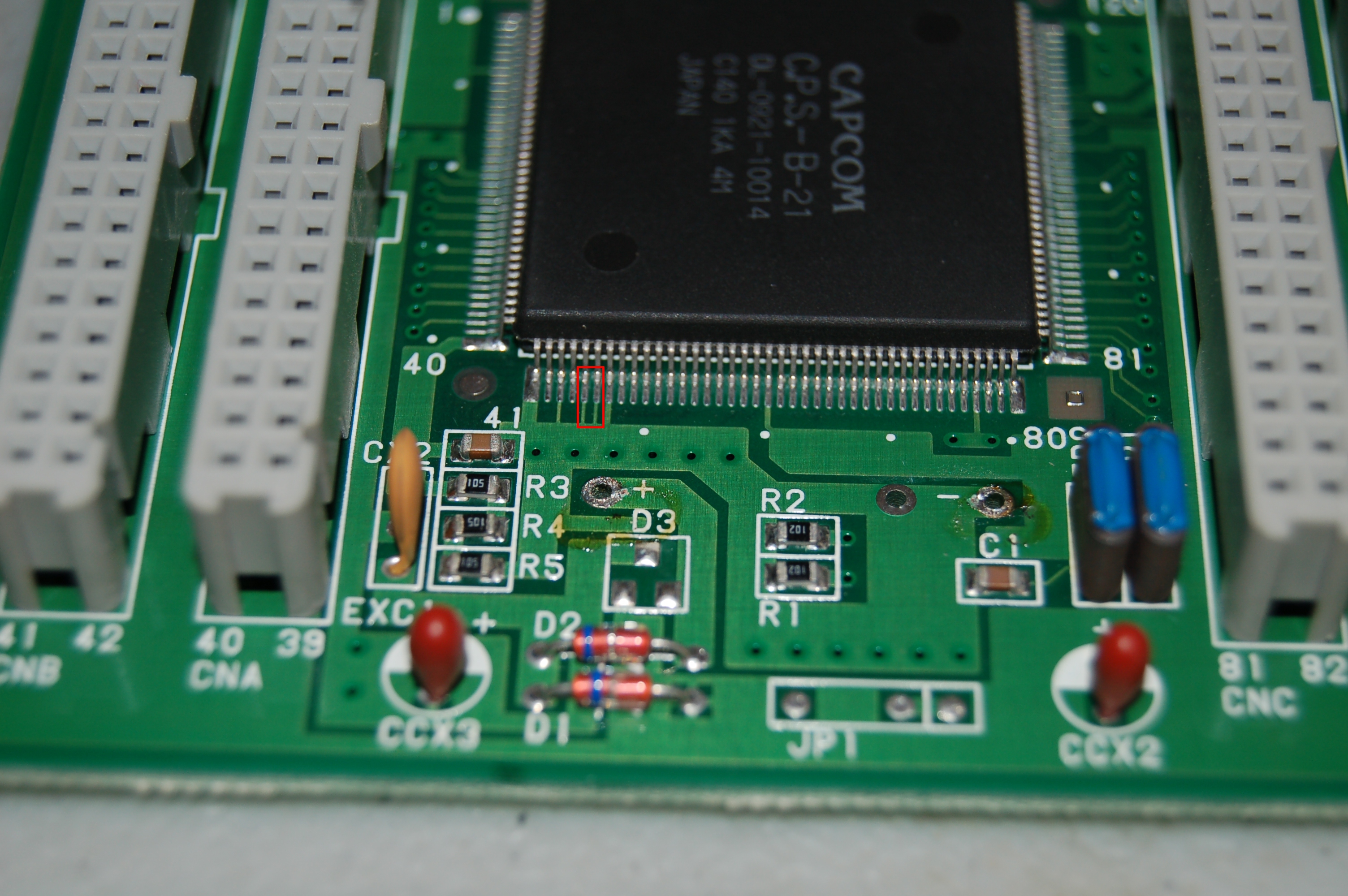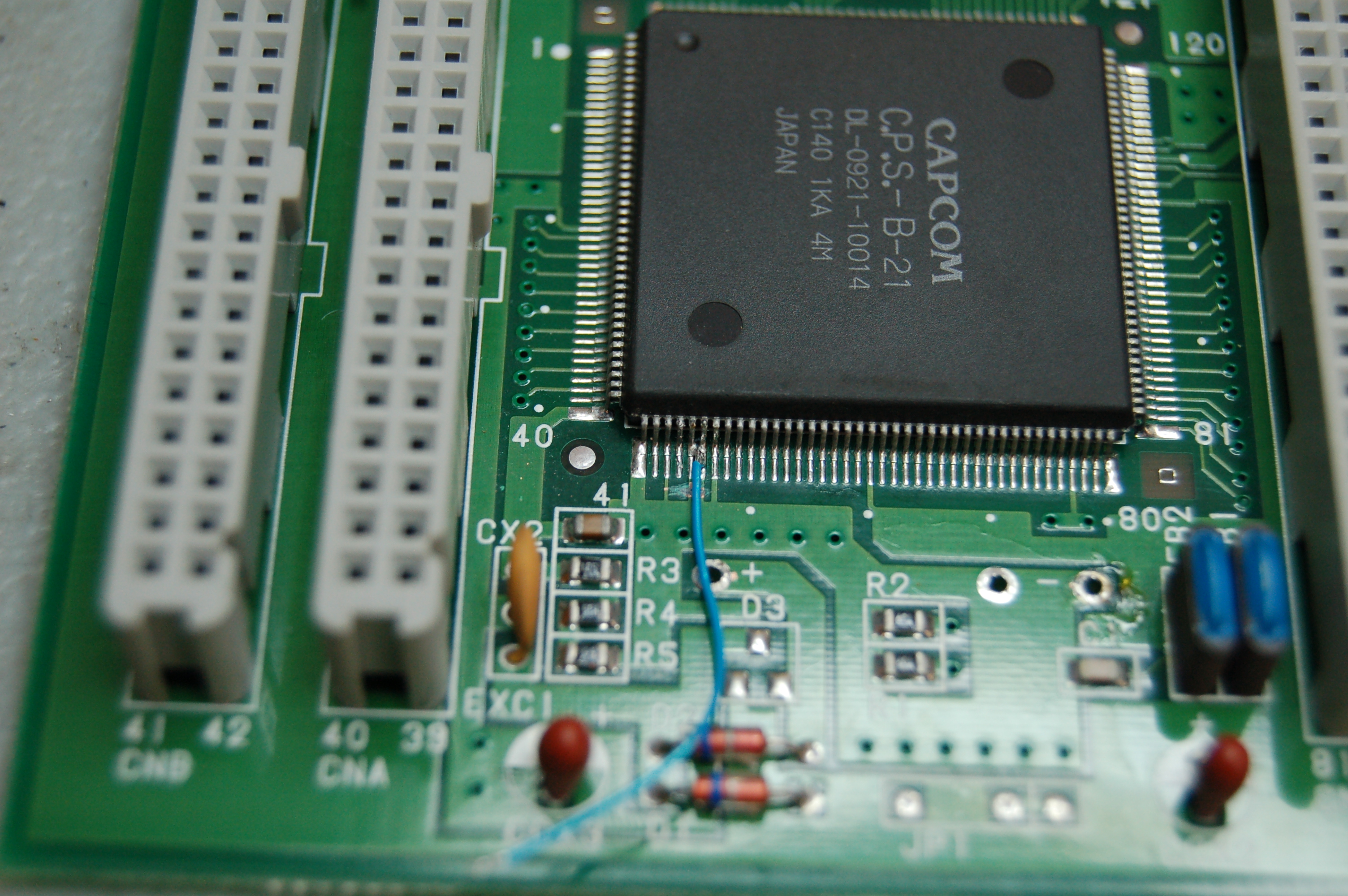 Ya habiendo removido la batería, es necesario modificar la placa para que funcione sin cifrado. Esta modificación se encuentra muchas veces ya realizada en placas hackeadas o clonadas de CPS1 originales, y esta bien documentada en Dead battery society, que es de donde aprendí éste procedimiento.