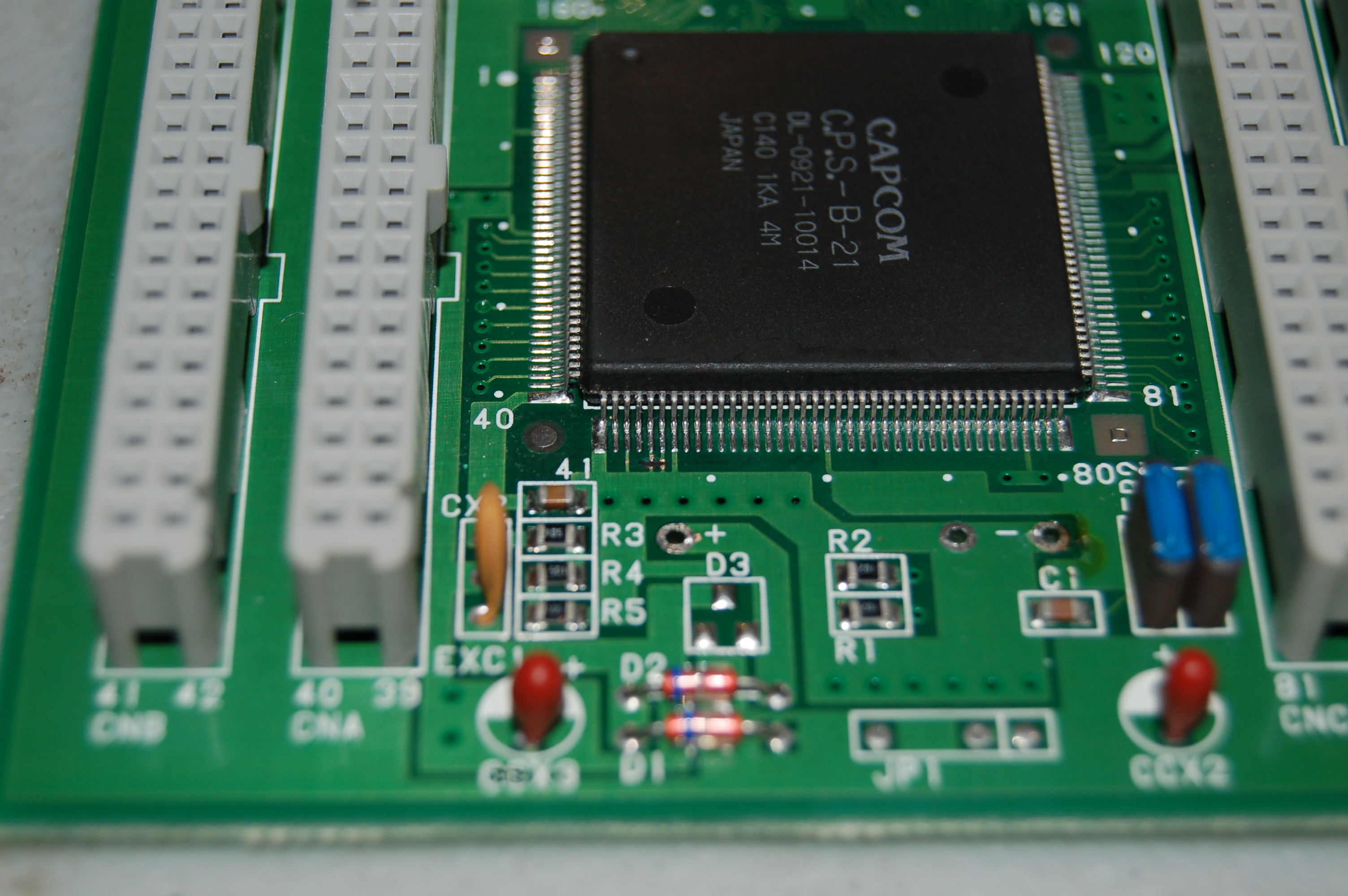 Estas PCBs cuentan con un conector especial que separa el cableado JAMMA hacia la PCB del CPU y la Q-Sound, el pinout ya se encuentra detallado en el wiki. Cuando tuve uno completo, preferí documentarlo ya que hasta hoy no di con él y durante un buen rato lo necesité.