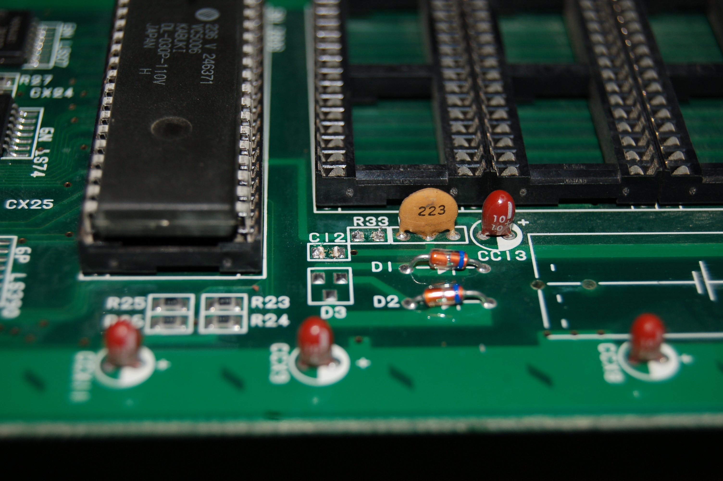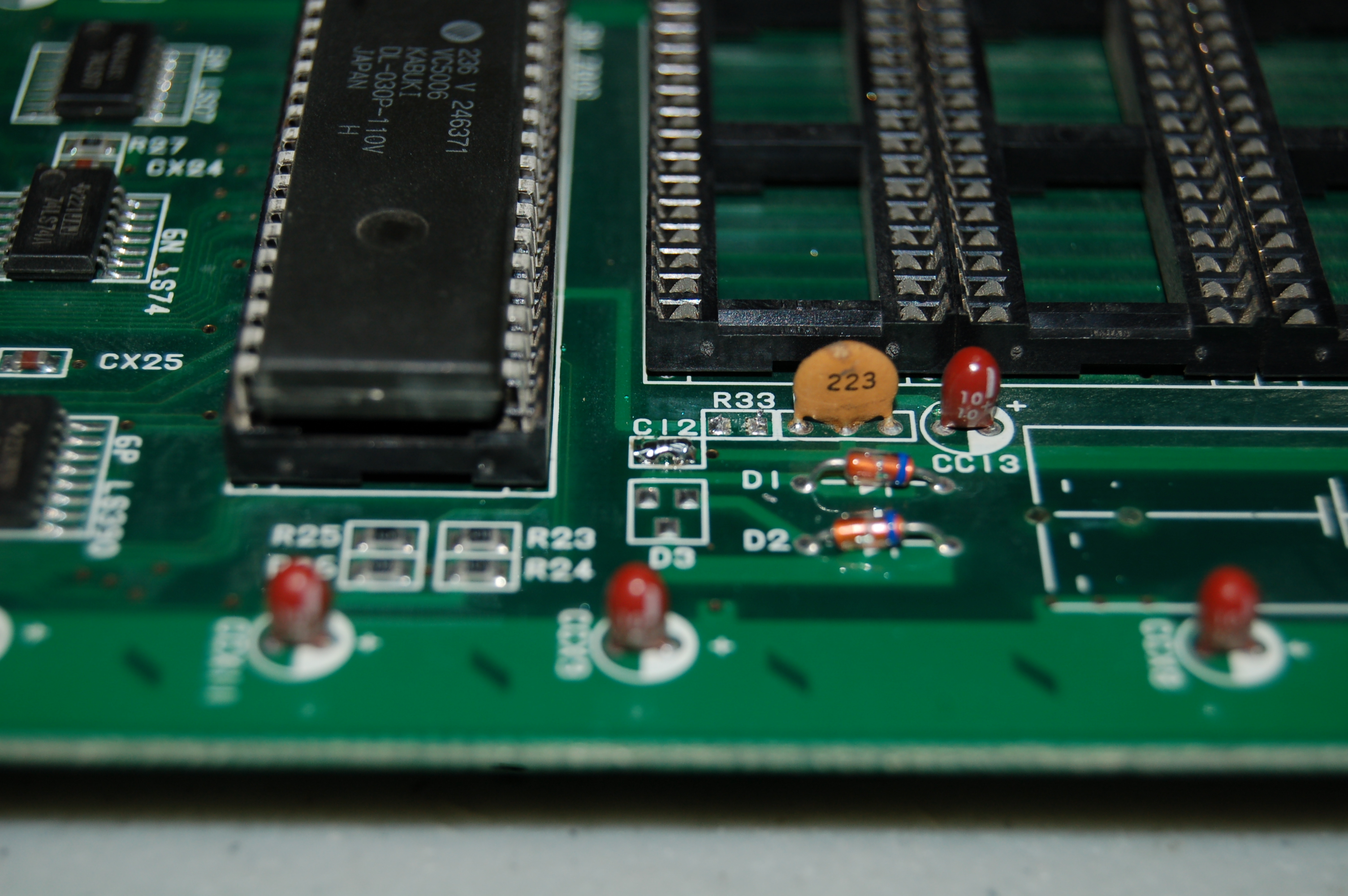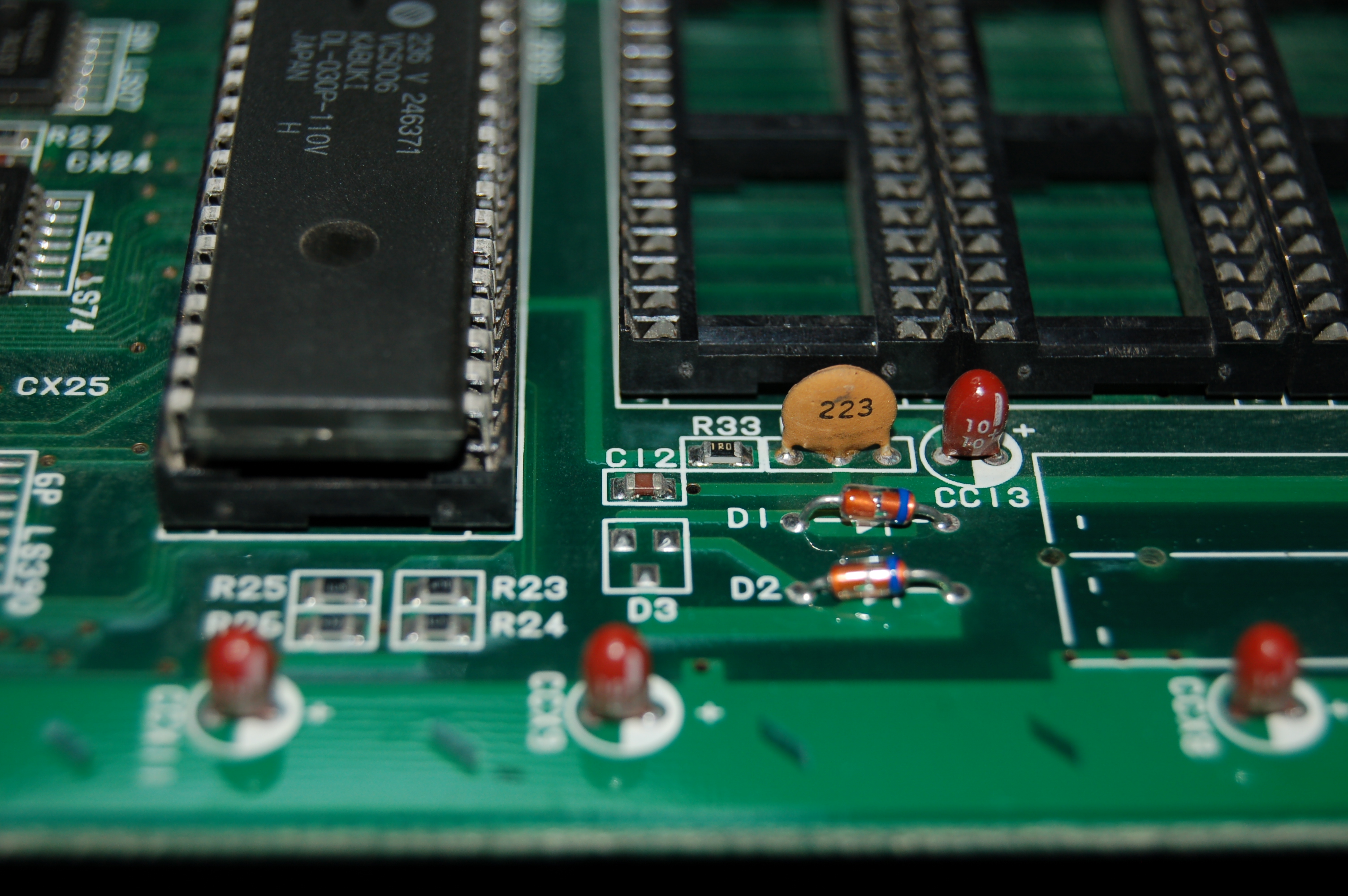 Después de esto, se deben remover la resistencia R33 y el capacitor C12, que son los que mantienen al CPu Z80 "Kabuki" trabajando en su modo cifrado. En la siguiente foto se muestra el area que incluye a ambos: