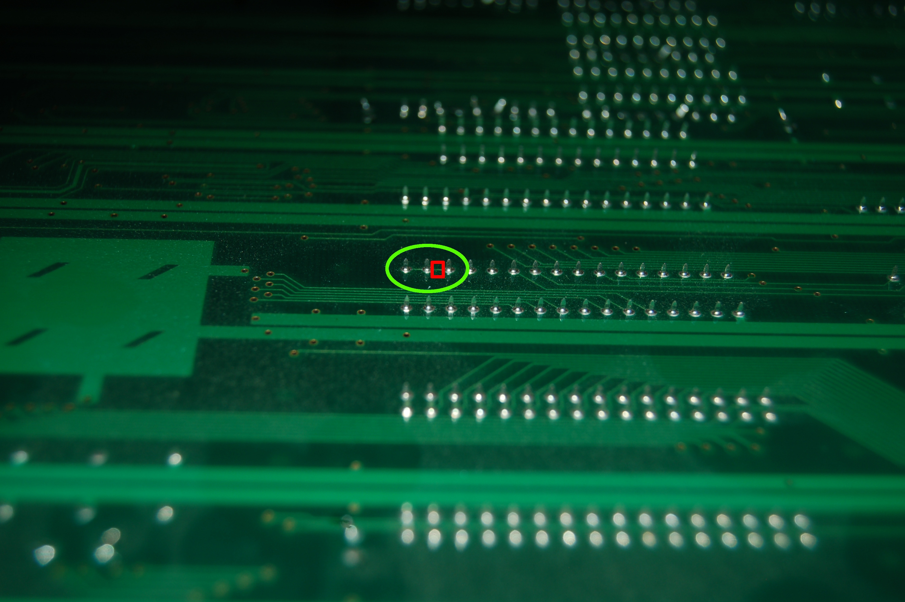 El círculo verde marca la zona de conexión entre los tres pines, y el cuadrado rojo marca la pista a cortar. La siguiente foto documenta el daño necesario: