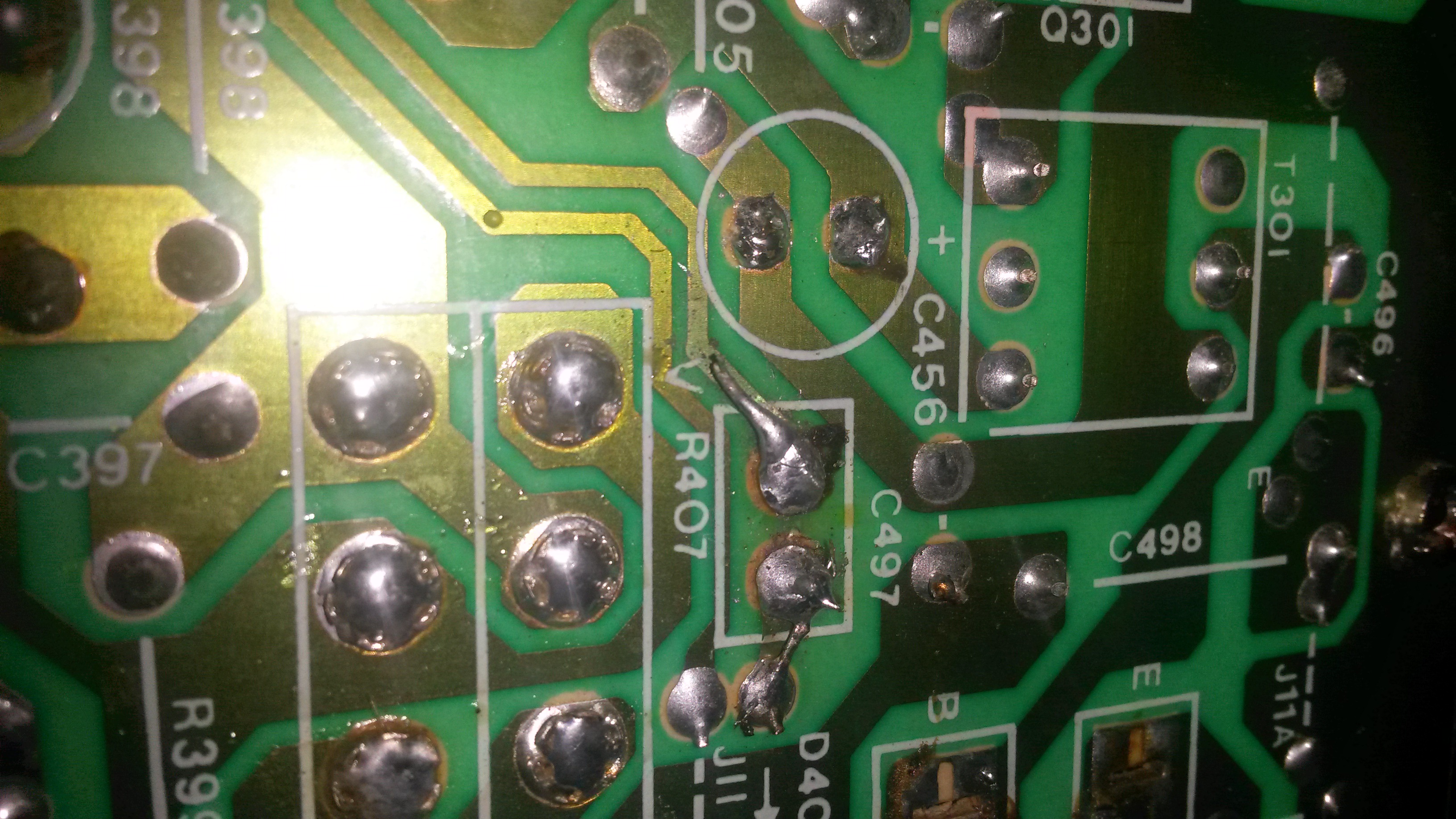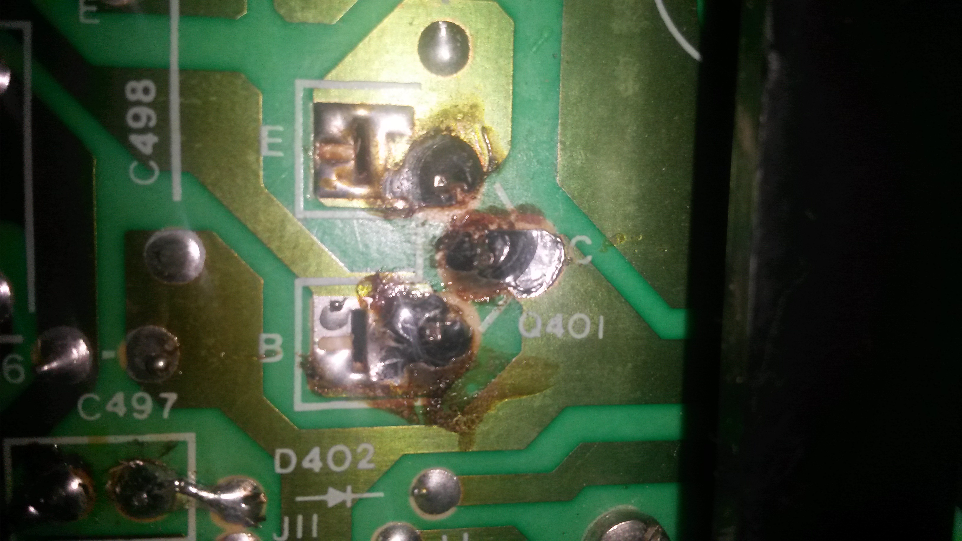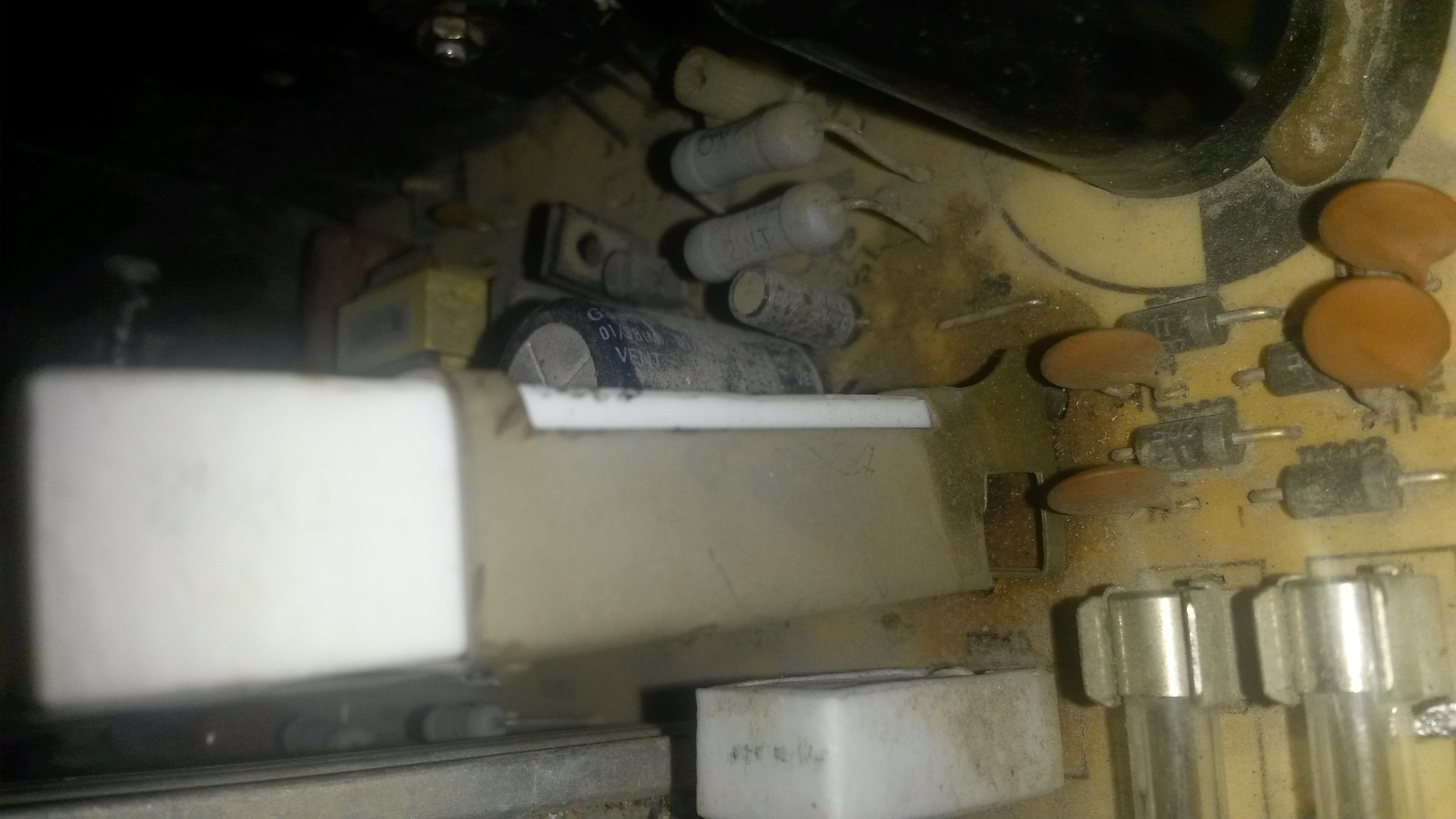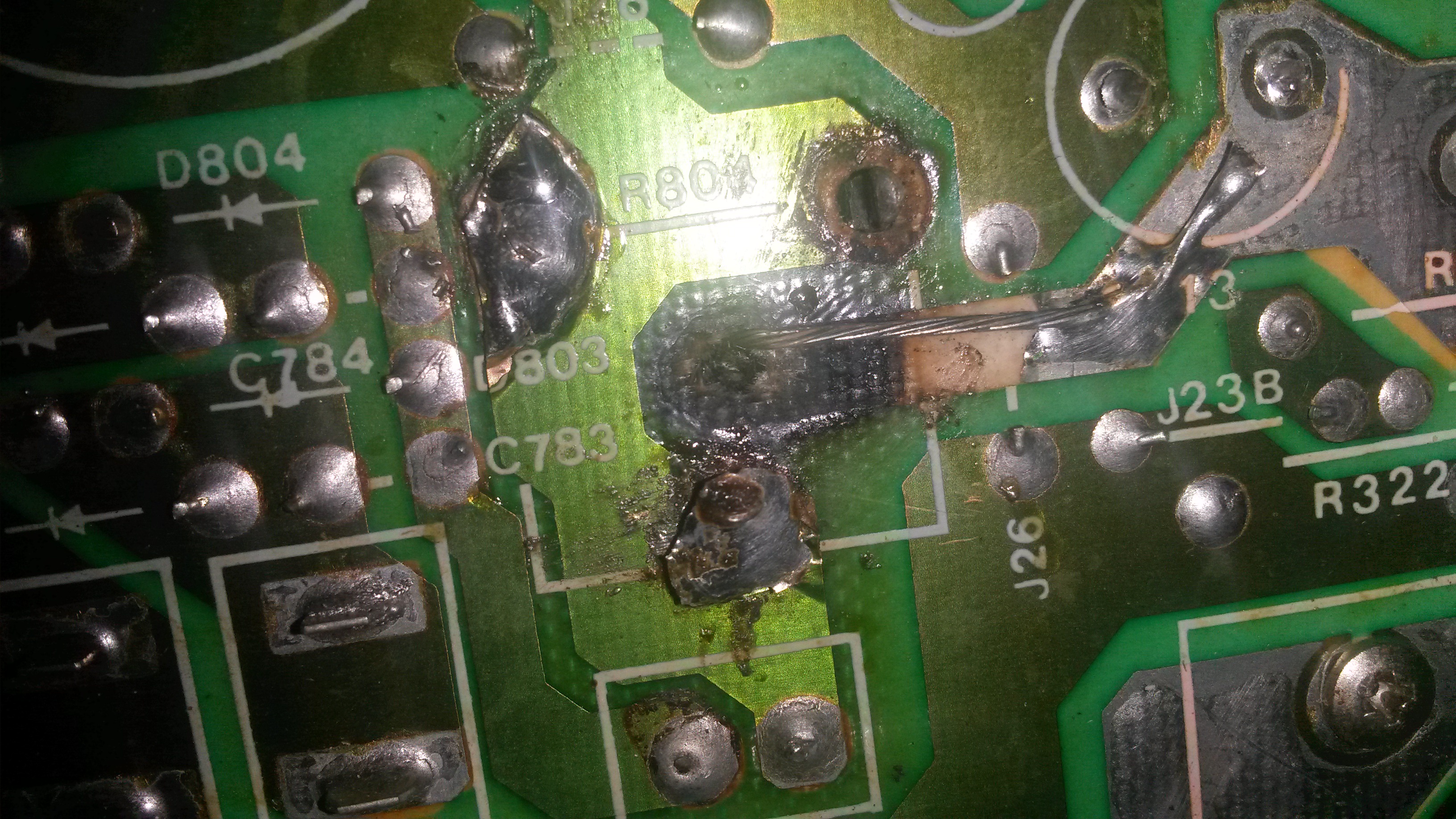 Bueno despues de quitar el chassis (descuoden no mori en el intento) me encuentro con una resistencia (eso supongo que es) que se levantaron las pistas y se ven quemada la conexion