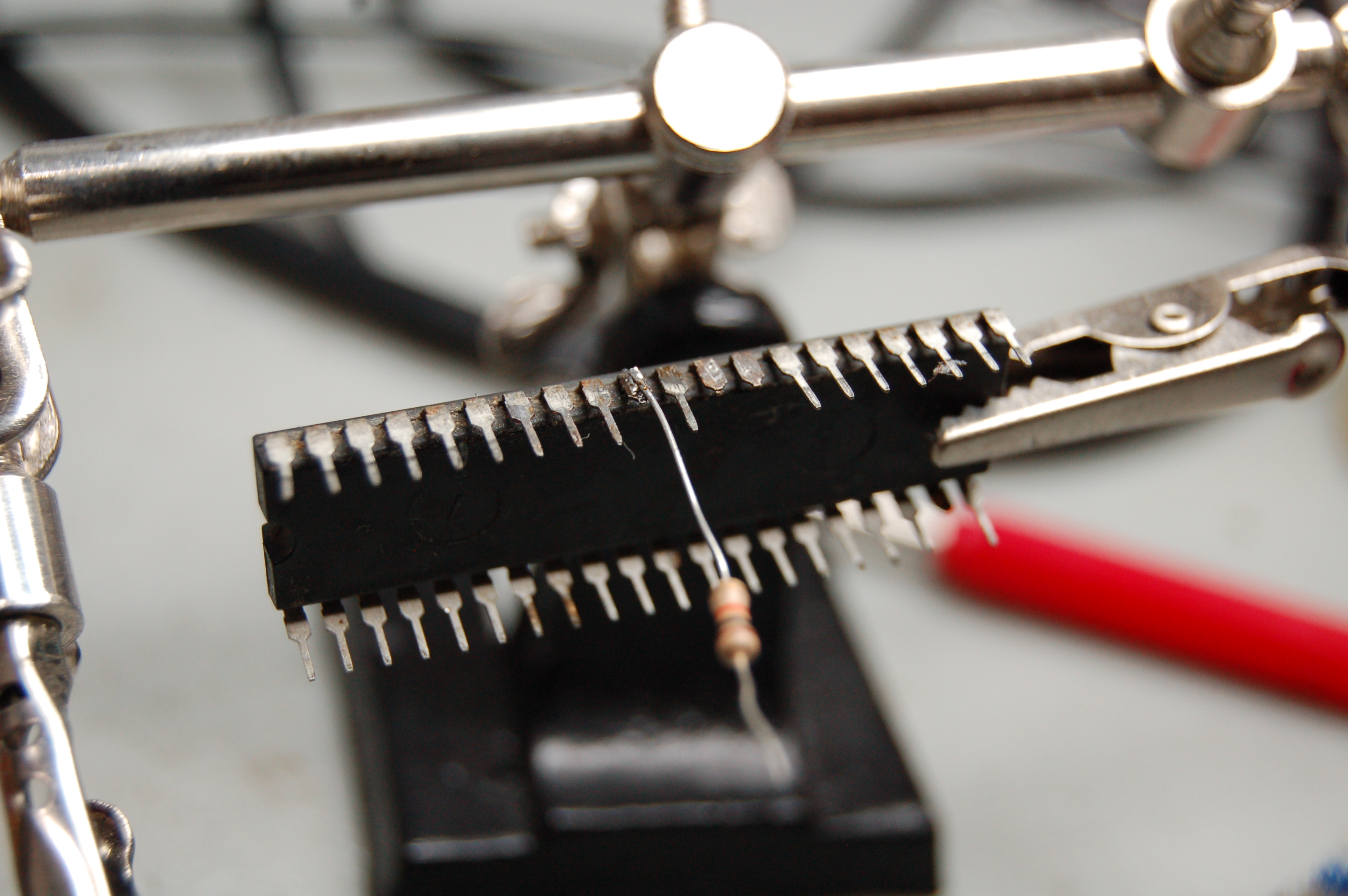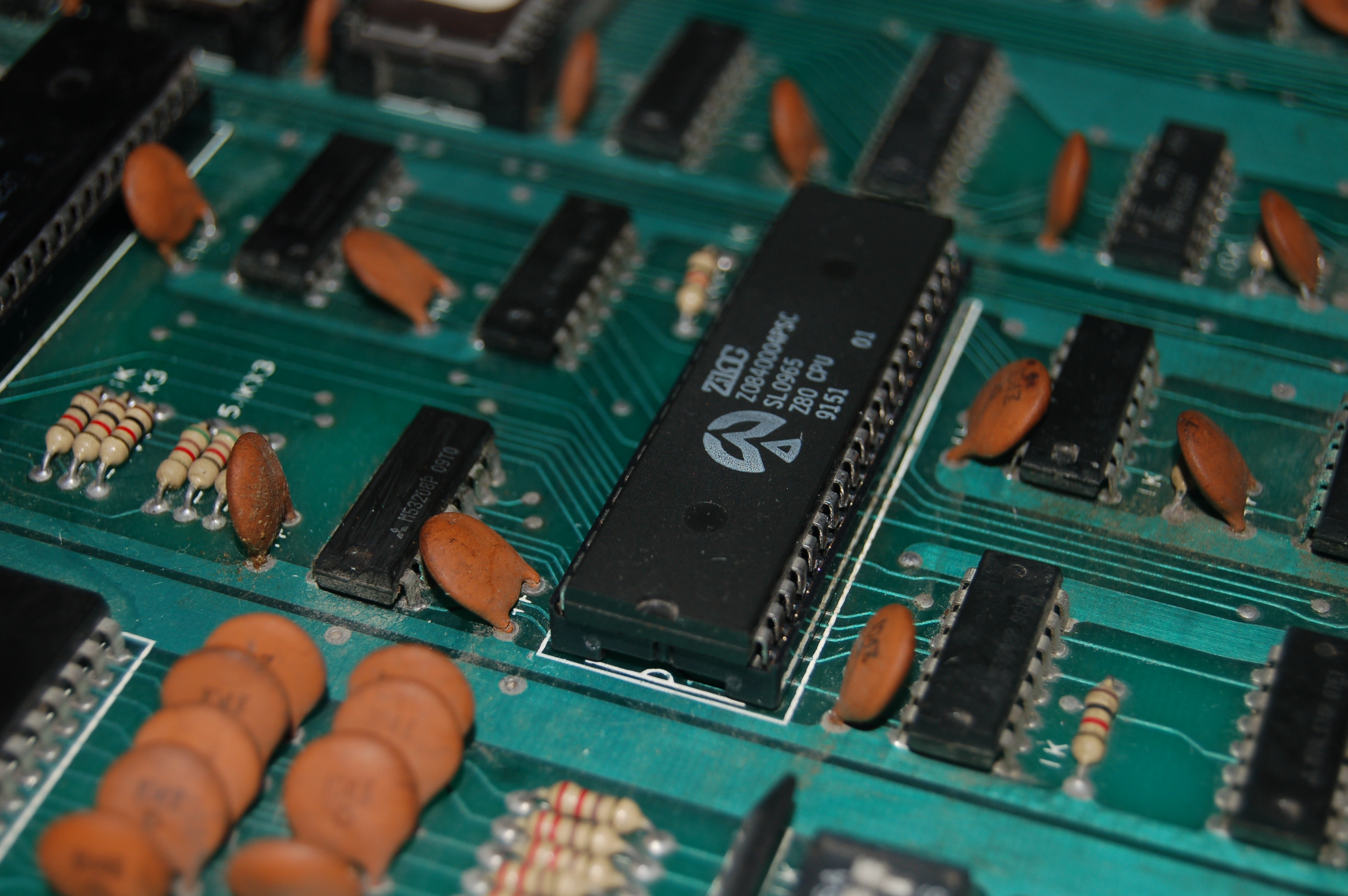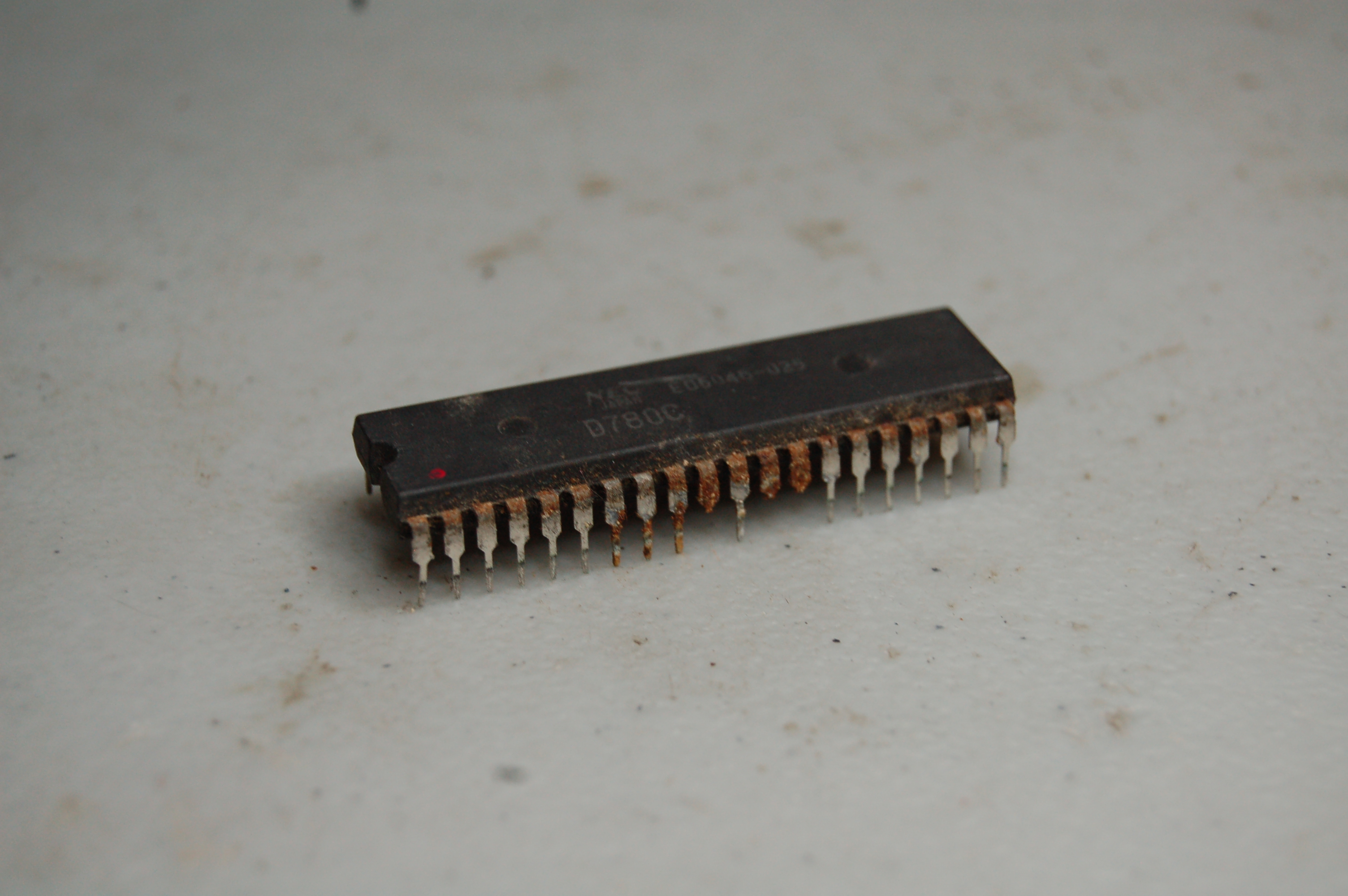 Una rápida búsqueda me reveló que se trataba de un clon de Z80, un CPU muy familiar y de uso generalizado. Inocentemente, procedí a limpiar todo. Tallando el óxido, limpiando con alcohol isopropílico e inclusive reconstruyendo las patas que habían sido carcomidas por el óxido:
